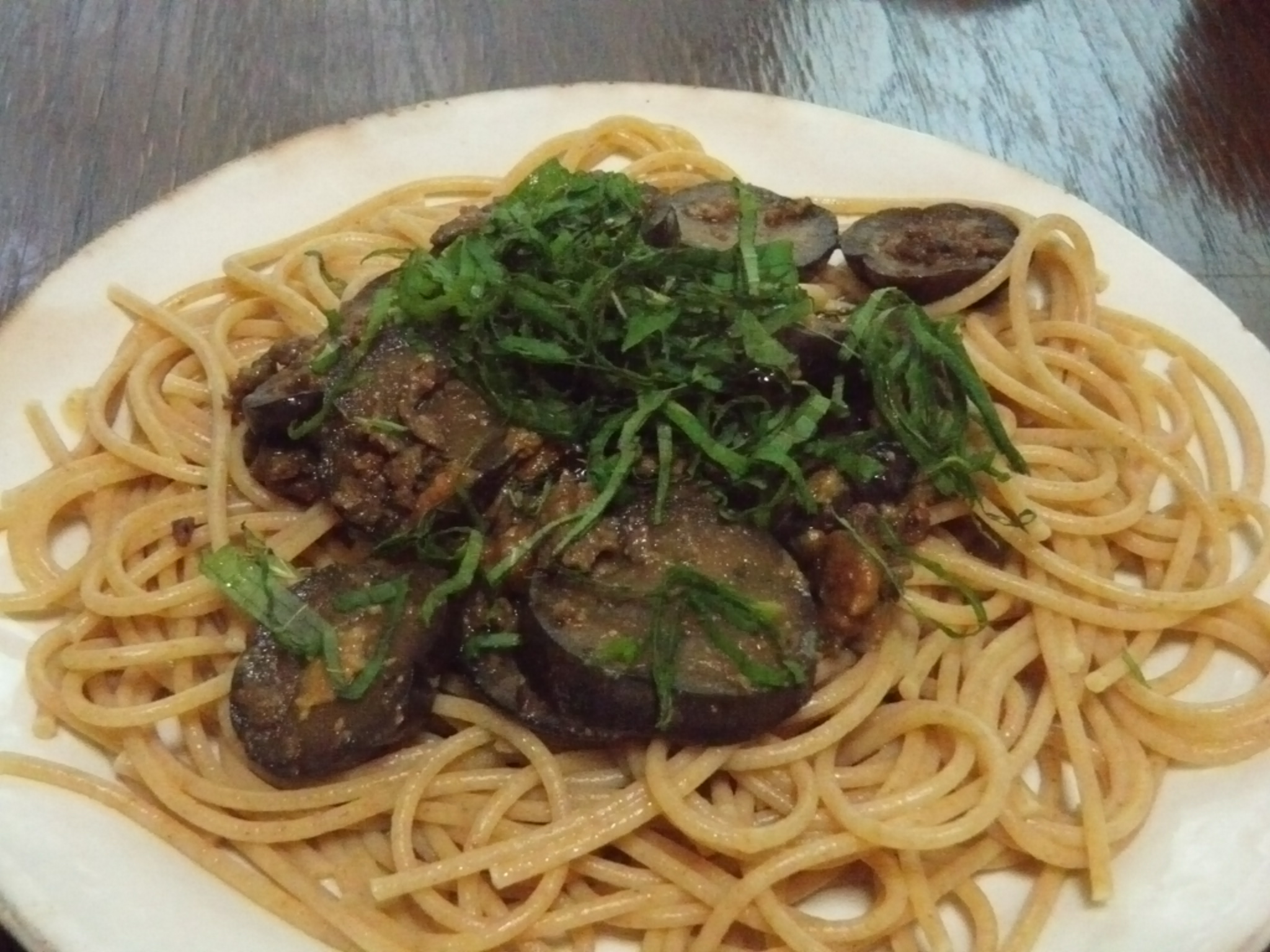 昨夜の残り物の茄子と豚挽きの味噌炒めを利用した全粒粉パスタです。