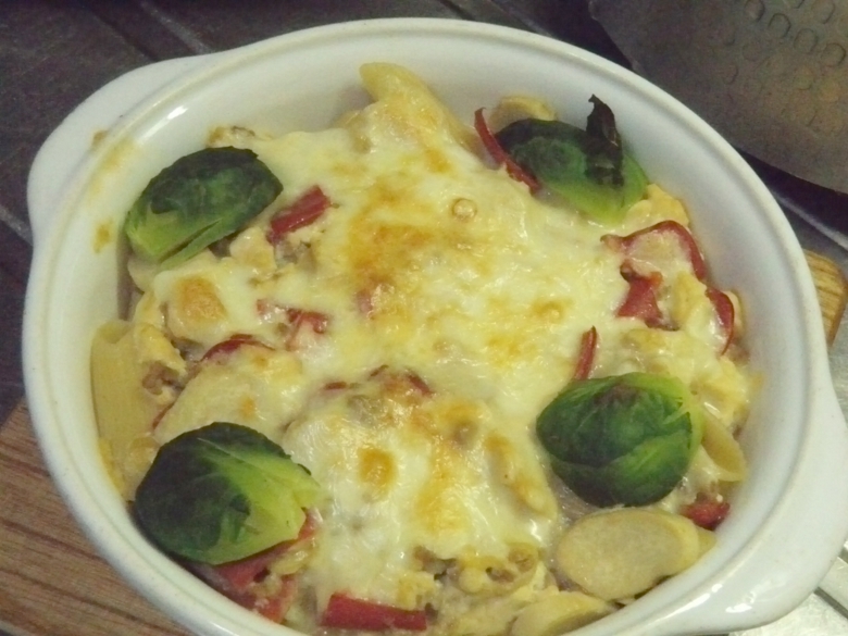 グラタン皿に移してピザ用チーズをふり掛け、オーブンで焼き色をつけました。