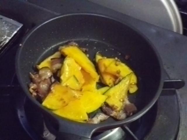 ジュワーッとかけた大蒜オイルの半分は残して、ベーコンと薄切り南瓜を炒めあわせて、これは相方のおつまみ。