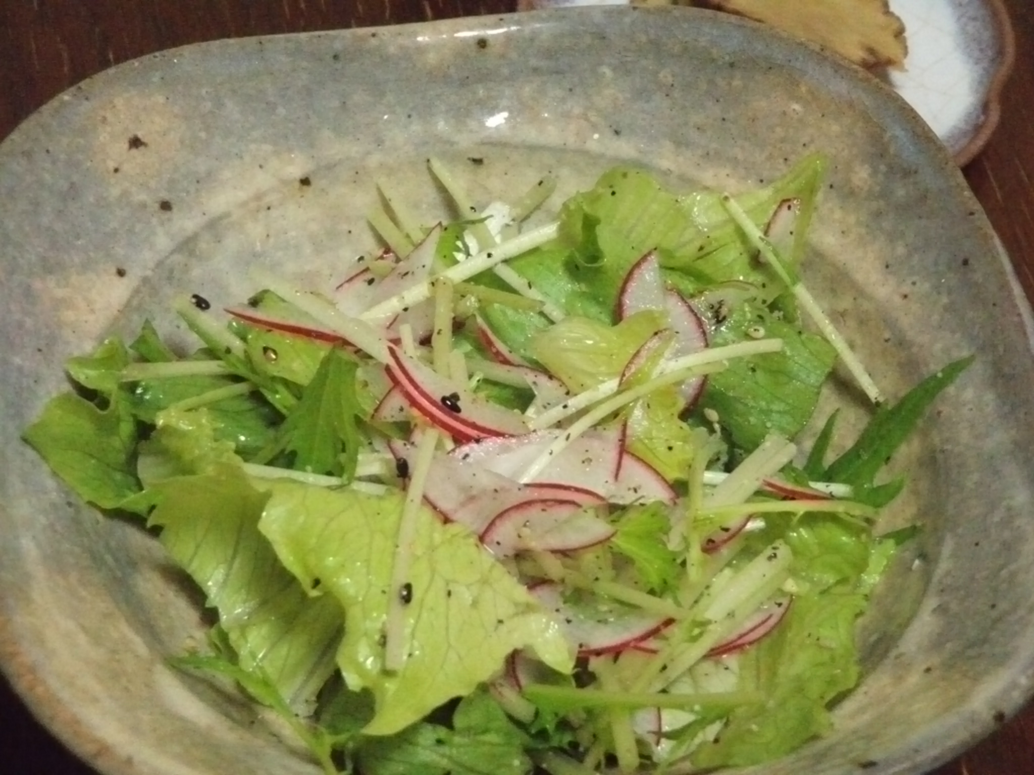 今日は水菜とレタス、グリーンリーフそれにラディッシュの薄切りを飾って。