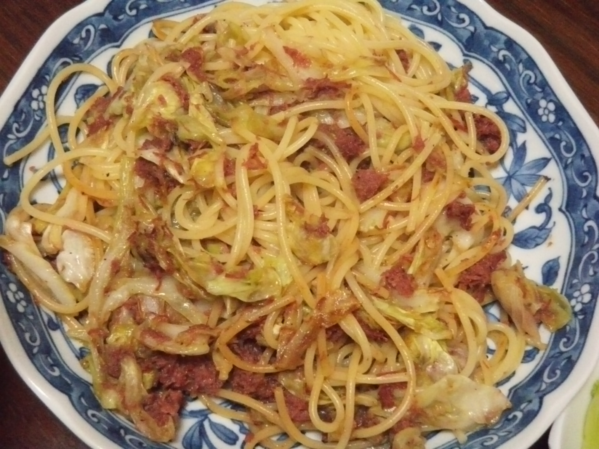 コンビーフとキャベツのパスタ。