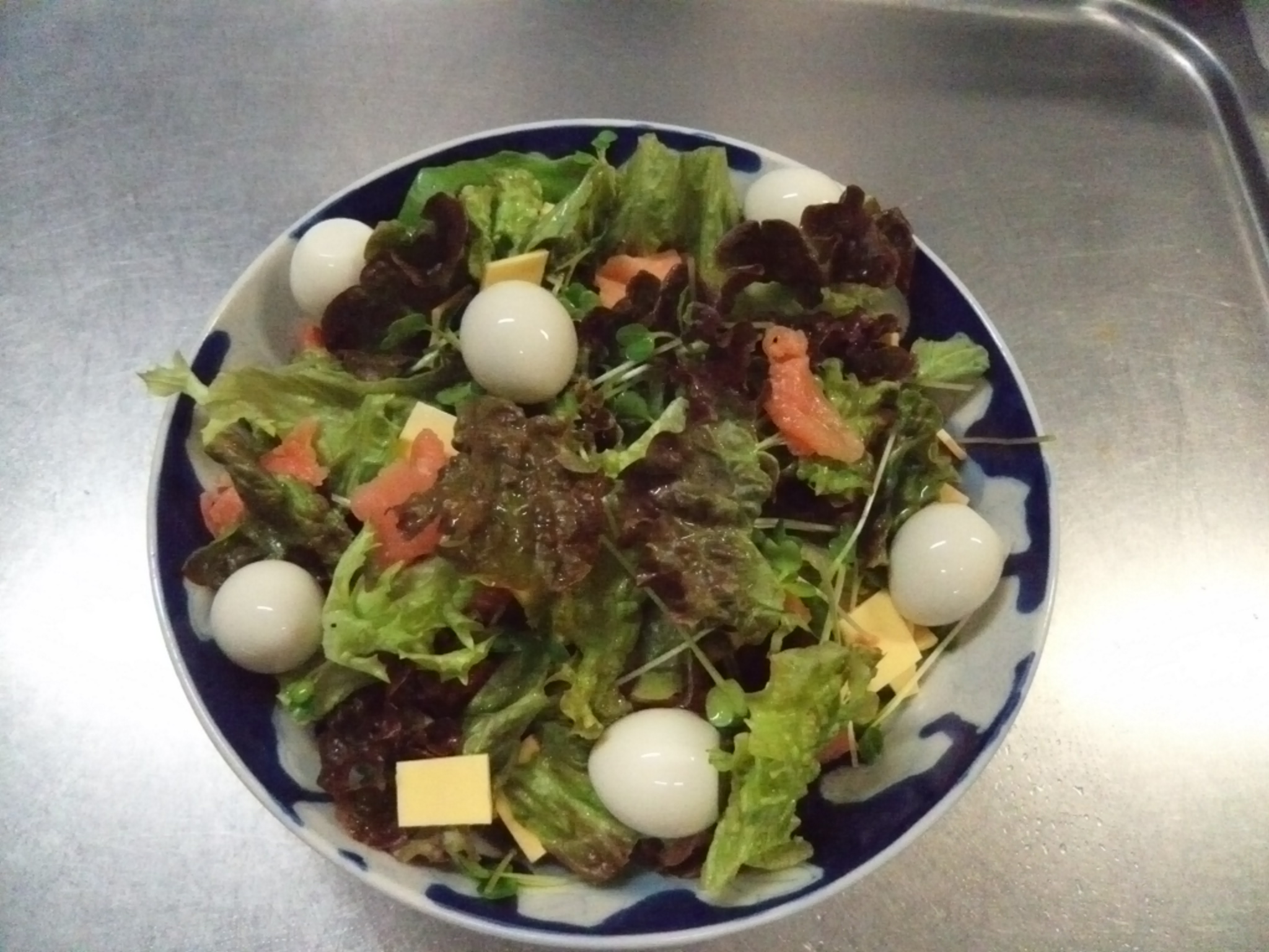 スモークサーモンとチーズと鶉卵のサラダ。