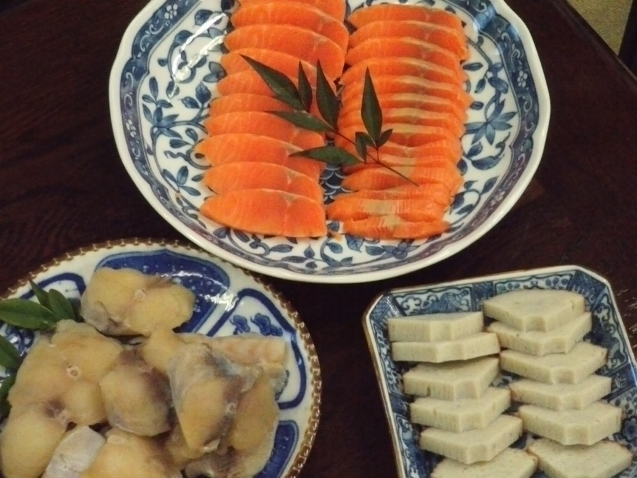 サーモンの刺身、焼き河豚、島根から頂いた野焼き。