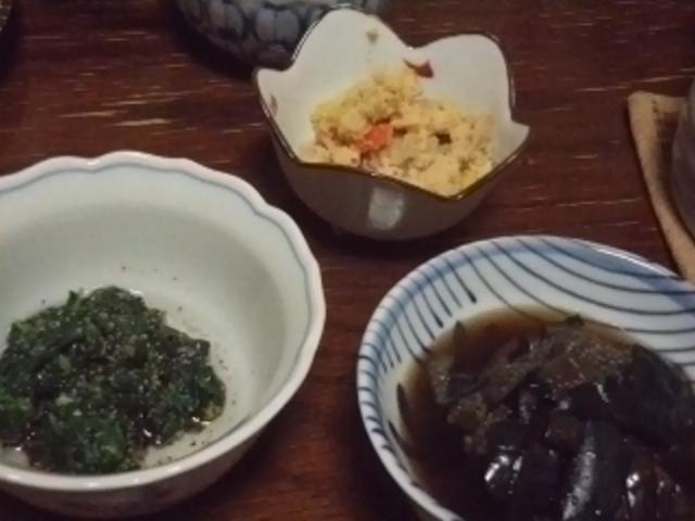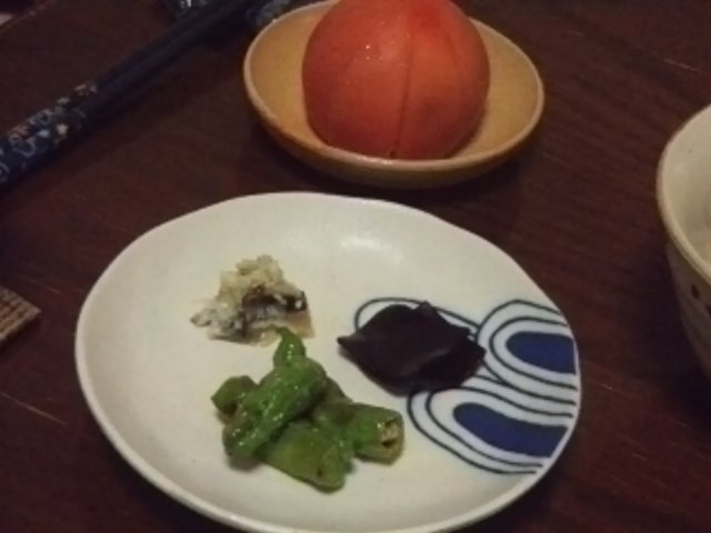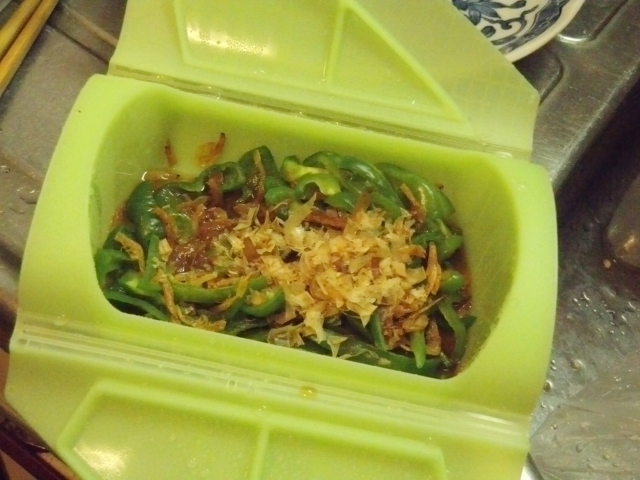 ピーマンを刻んでチンして干し海老を混ぜ込み、ソバツユで和えて鰹節をまぶすというもの。