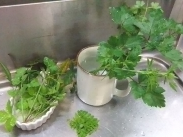 盛付けように庭のあちこちから採集してきた葉っぱたち。