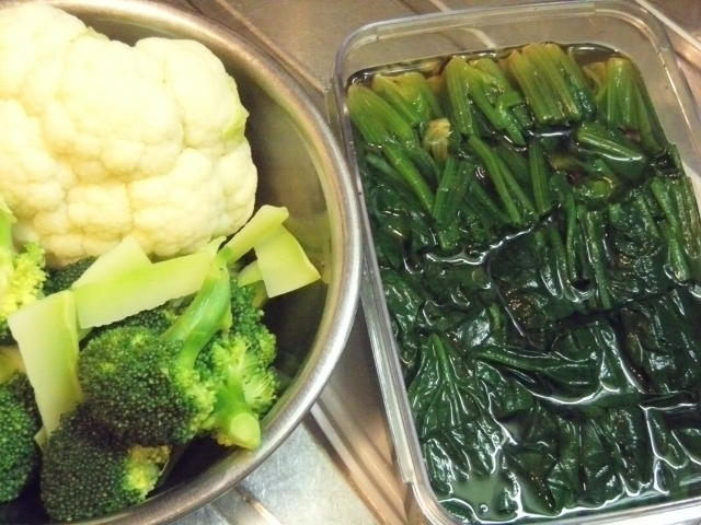 あとは作り置きのポテトサラダ、ブロッコリーの茹でたもの、白菜漬けと沢庵。
