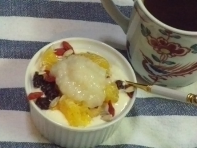 朝食は例によって豆乳ヨーグルトに夏蜜柑・レーズン・クコの実・南瓜の種・ドライフィグ、アールグレイ。