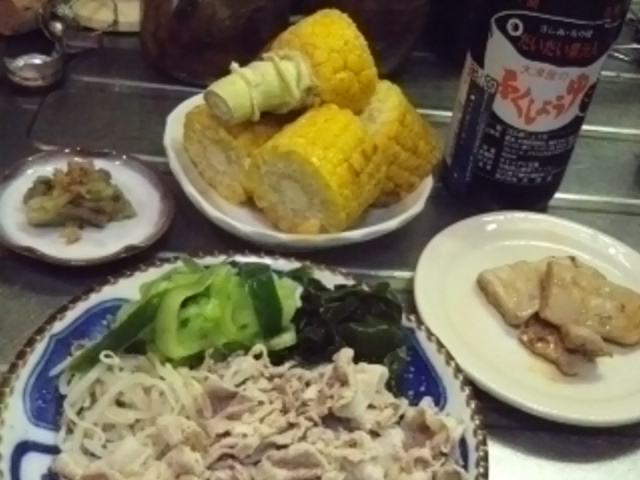 実家の家庭菜園で採れたての茄子と胡瓜、ご近所から頂いたばかりの玉蜀黍などで夕ご飯です。