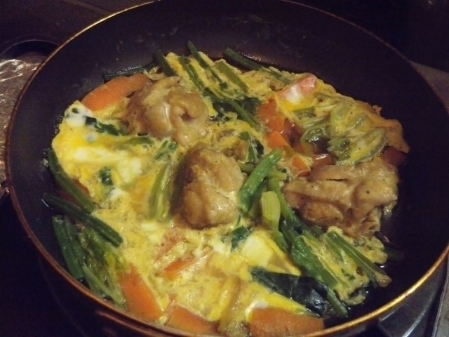夕食は2回の鶏から揚げ(正確には揚げてないけど)の残りに蒸した人参とほうれん草のお浸しを加えて卵とじに。