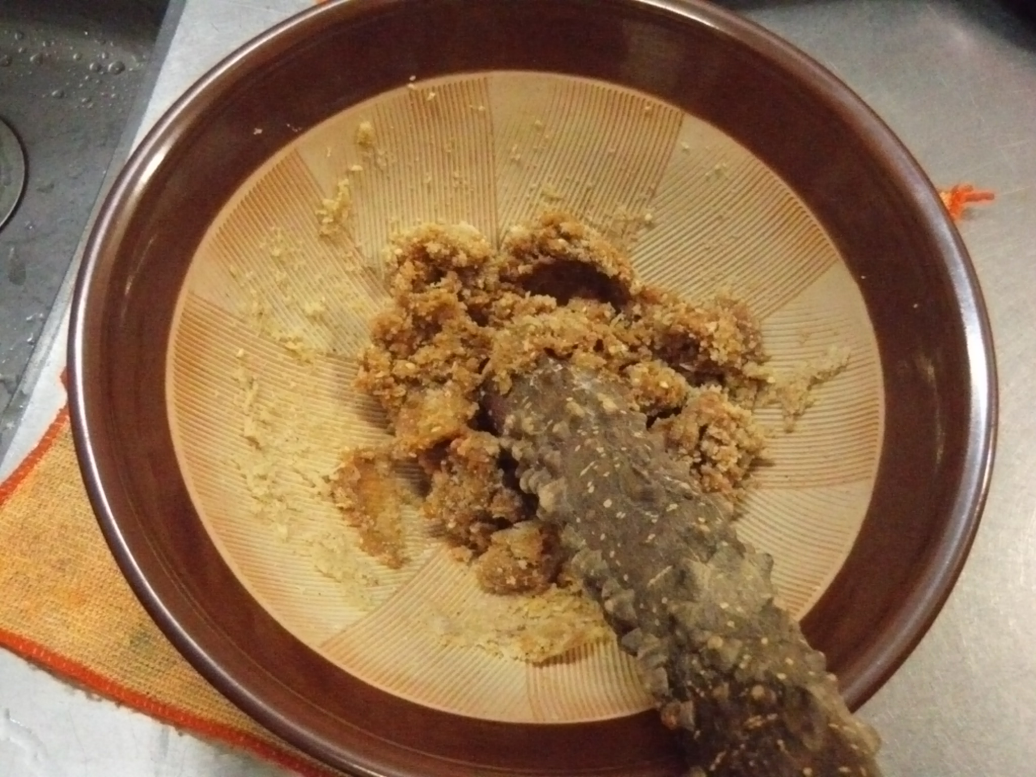 そこに砕いた魚を入れて擂ります。
