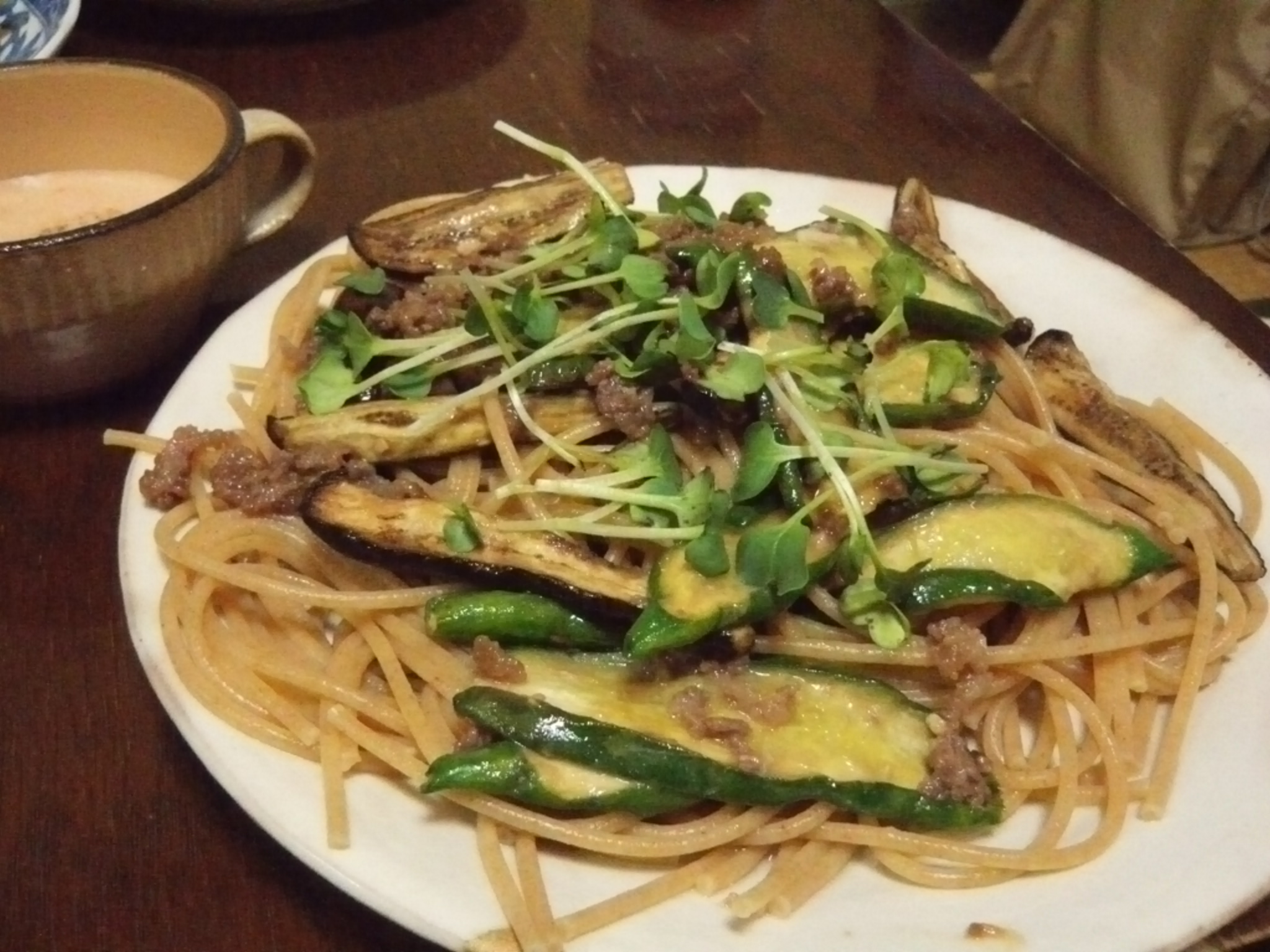 全粒粉のパスタとちょっと甘めの肉味噌で。