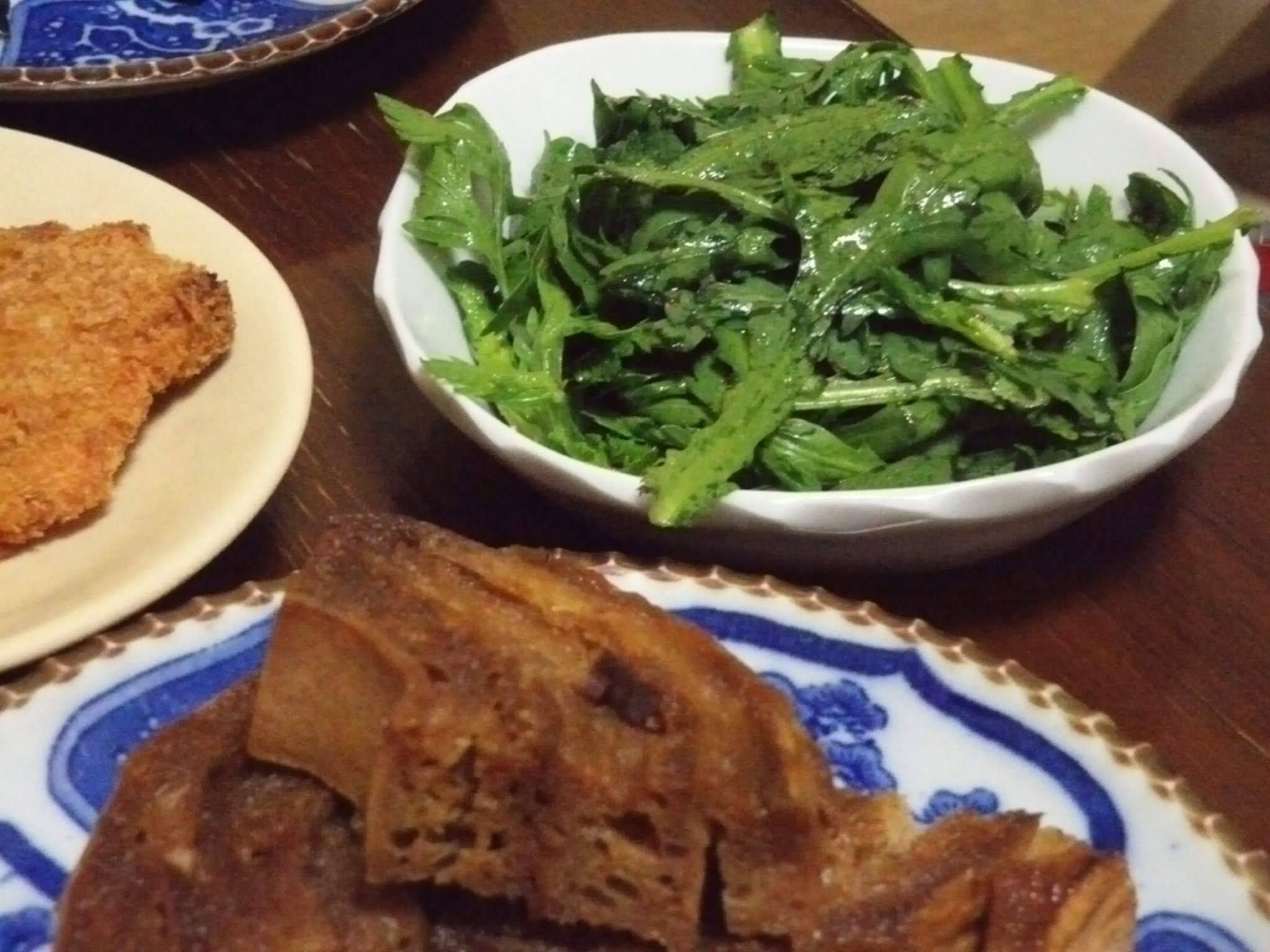 車麩の照焼き、春菊のナムルちょこっとチキンフライ。
