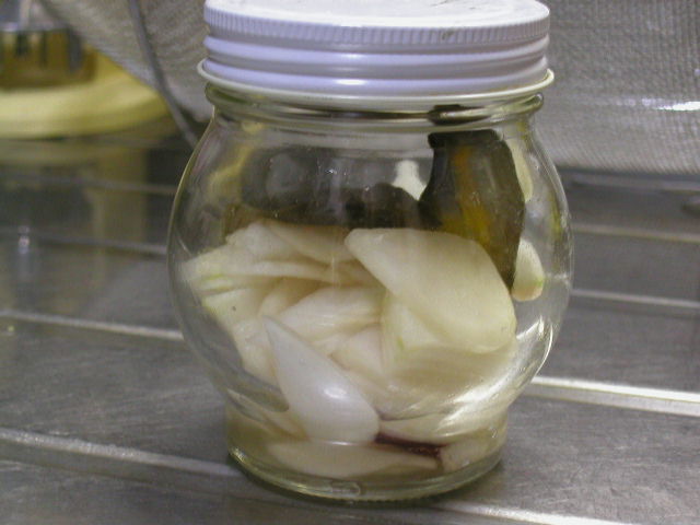 2.瓶に切った野菜、たかの爪半分程、塩小さじ半分程お好みで、昆布3×5cm位の大きさ1枚を入れる。