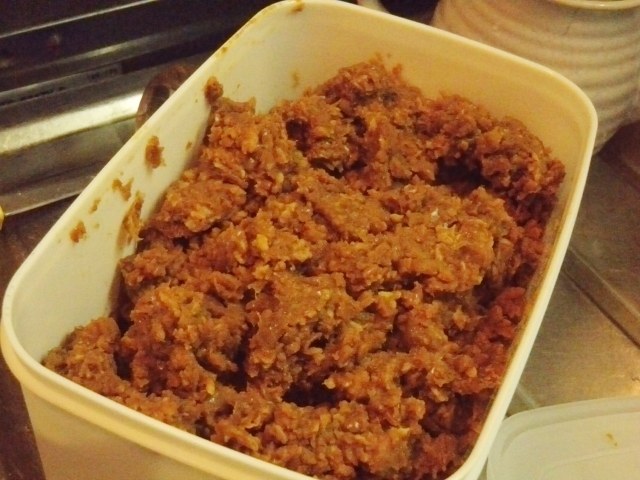 味噌作りって大変そうな気がしますが、どこかの雑誌に出ていたやり方を真似て「茹でた大豆は厚手のビニール袋に入れて擂り粉木で叩いて潰す」という手段をとったので簡単でした。