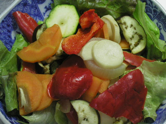 昨日あったのは小松菜の乾煎り、キャベツ・胡瓜・人参の塩漬け、使い残しの赤ピーマンを刻んだもの、やはり使い残しの水菜の刻んだもの、じゃが芋・人参・玉葱のスープ煮、大豆の水煮、あとは干し野菜の色々。