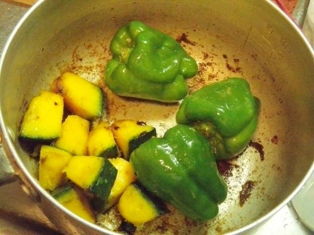ちょうど、使っちゃいたい南瓜一切れに大袋で買い込んだピーマンがあるし。