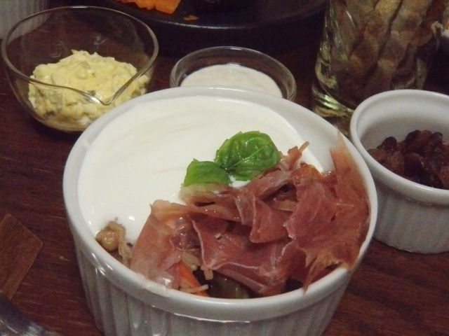 野菜室の有り合わせで作ったラタトゥイユで和えたパスタの上に生ハムと水切りヨーグルトをトッピングしてあります。