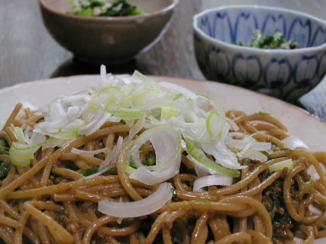 豚挽き肉味噌の全粒粉パスタ、菜の花のナムル、ほうれん草のお浸し、ほうじ茶
