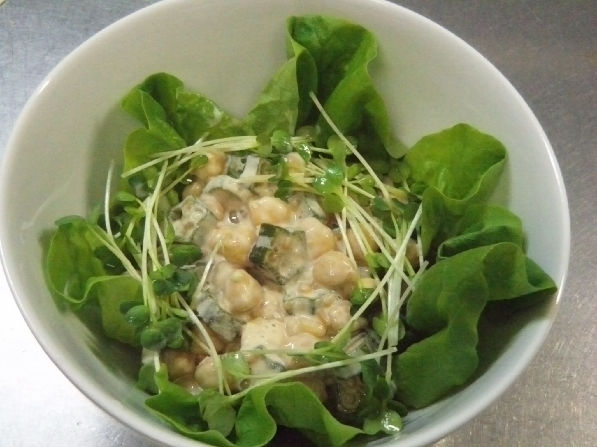ヒヨコマメと柚子胡椒漬けオクラの醤油麹マヨネーズのサラダ。