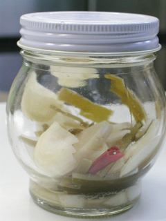 2.瓶に切った野菜、たかの爪半分程、塩小さじ半分程お好みで、昆布3×5cm位の大きさ1枚を入れる。