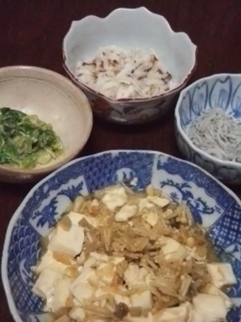 エノキダケと搾菜の微塵切りを胡麻油で炒め、水切りした豆腐を加え、醤油・味噌・味醂で味付けしただけ。豆板醤でもちょっと入れて、もう少し辛くしても良かったかな?