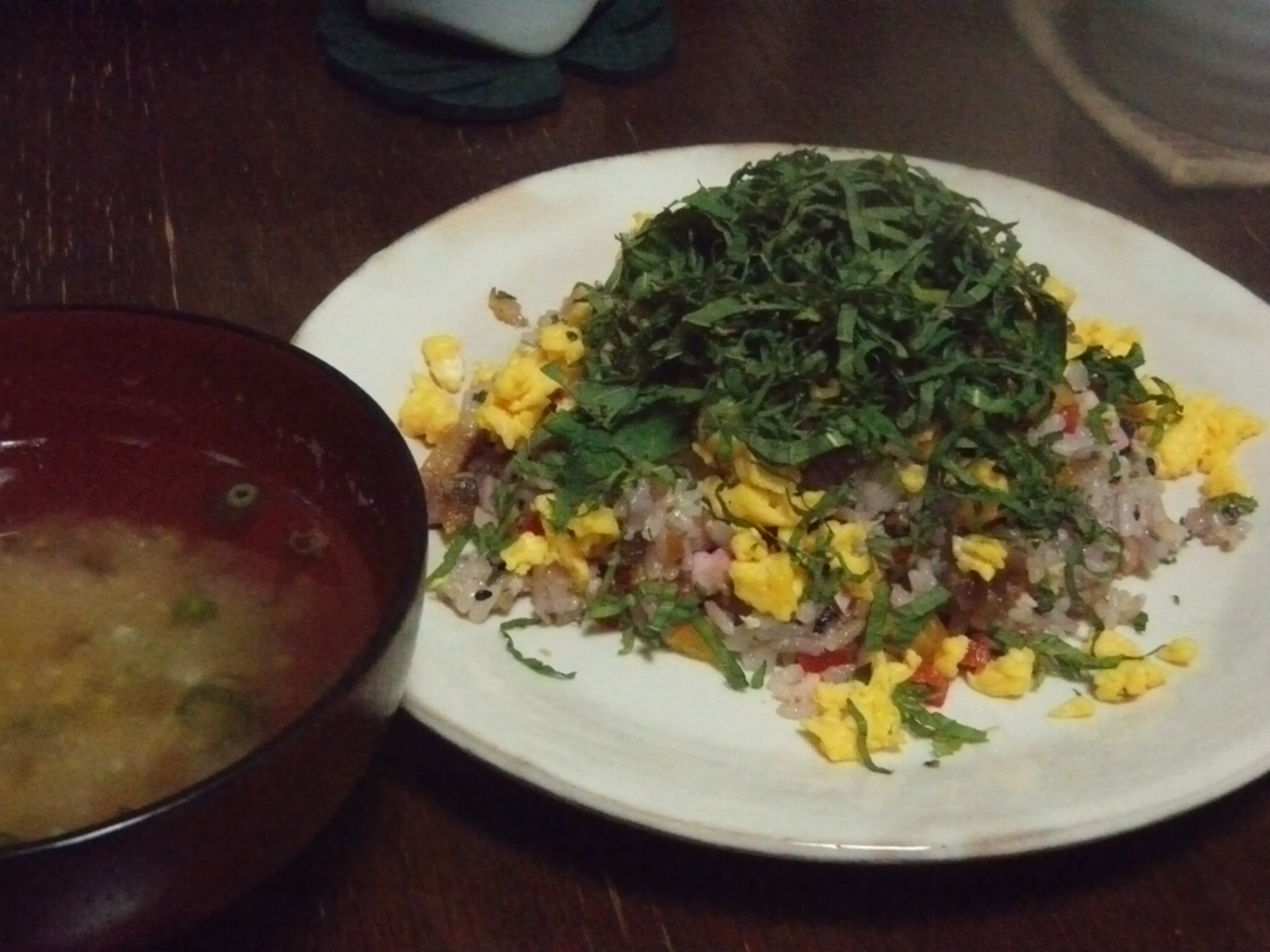 十穀米を酢飯にして、残り物の鯵の塩麹焼き、ピクルスのカリフラワー・パブリカ・胡瓜・人参の刻んだもの、味噌漬け胡瓜・胡麻・塩味炒り卵を混ぜたもの。青紫蘇の千切りをたっぷりトッピング(いくらなんでも多すぎでしょ)