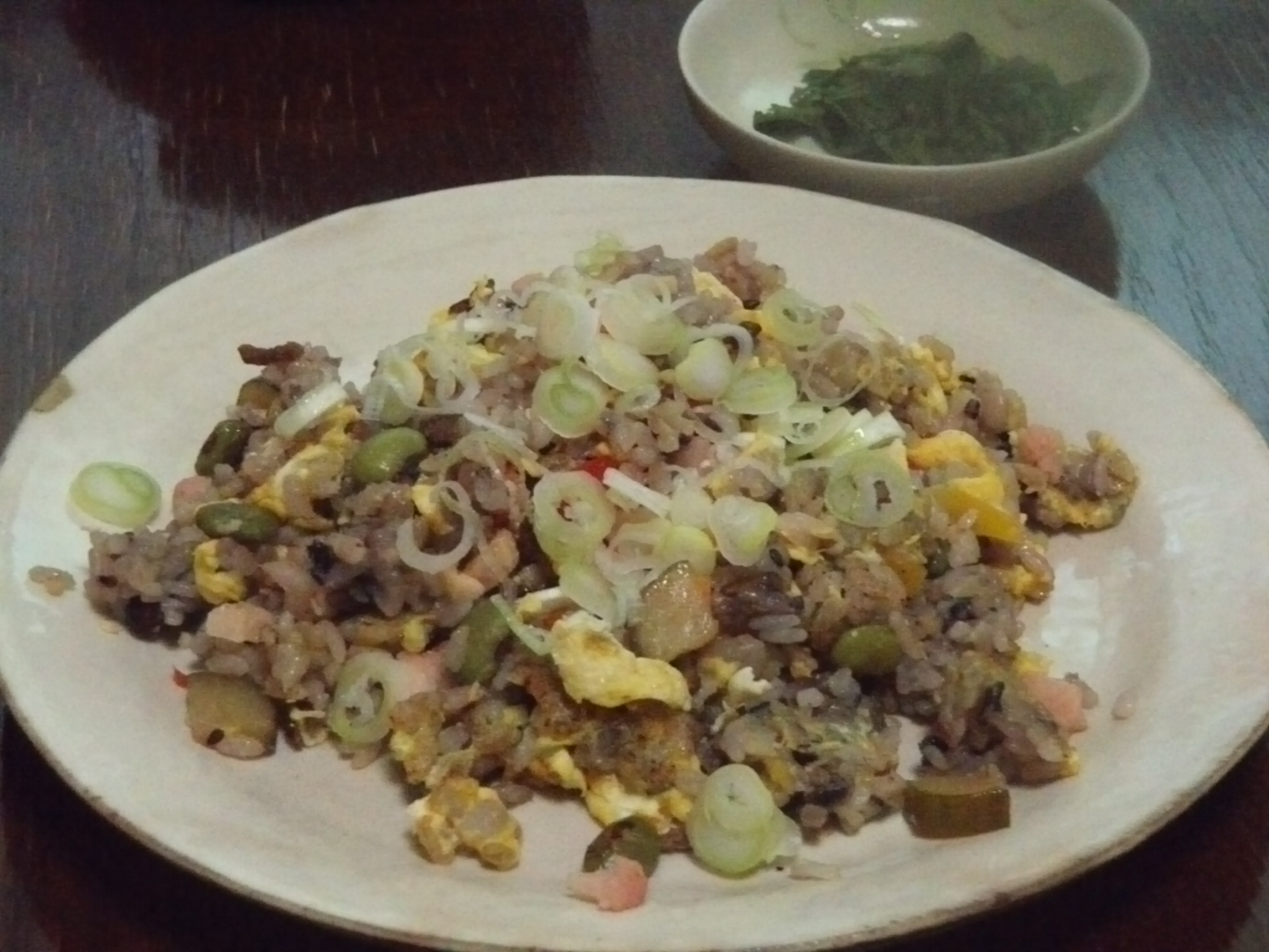 私の一人お昼。残り物を刻み込んだ炒飯とモロヘイヤ。