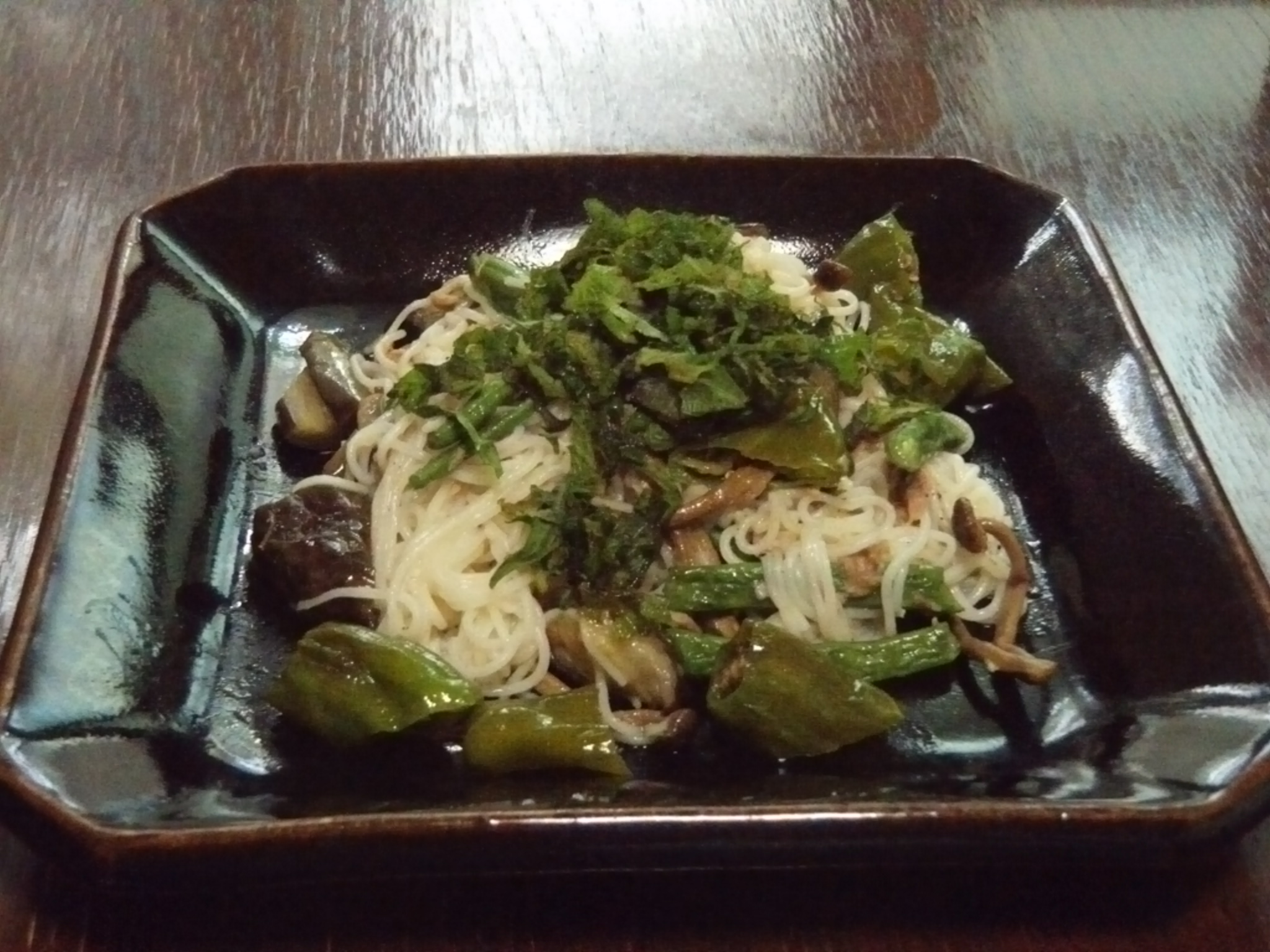 残り物のソーメンにやはり残り物の焼き茄子と焼きピーマン、しし唐の炒め物の残り、ツナ缶の残り等を炒め合わせて、これだけは採りたての青紫蘇をたっぷりかけた一人ご飯。